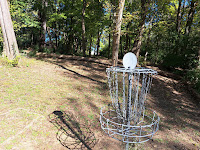 Comments: now the course breaks out into the open more or less to stay. Some dense brush and low overhanging branches guard the right side, but you have all the space in the world to the left. The dense woods also sits closely behind the basket. #5 tee is to the left near the bike path and back toward the tee.