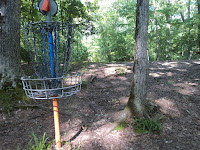 Comments: this flat ravine-bottom hole plays across a seasonal wet area that continues up the left side of the hole. You'll have to challenge the wetland for a chance at birdie or hope for a good bounce off the hill to the right. Lots of small trees stand between the tee and the basket, so choose your line of play carefully. #3 tee is behind the basket.