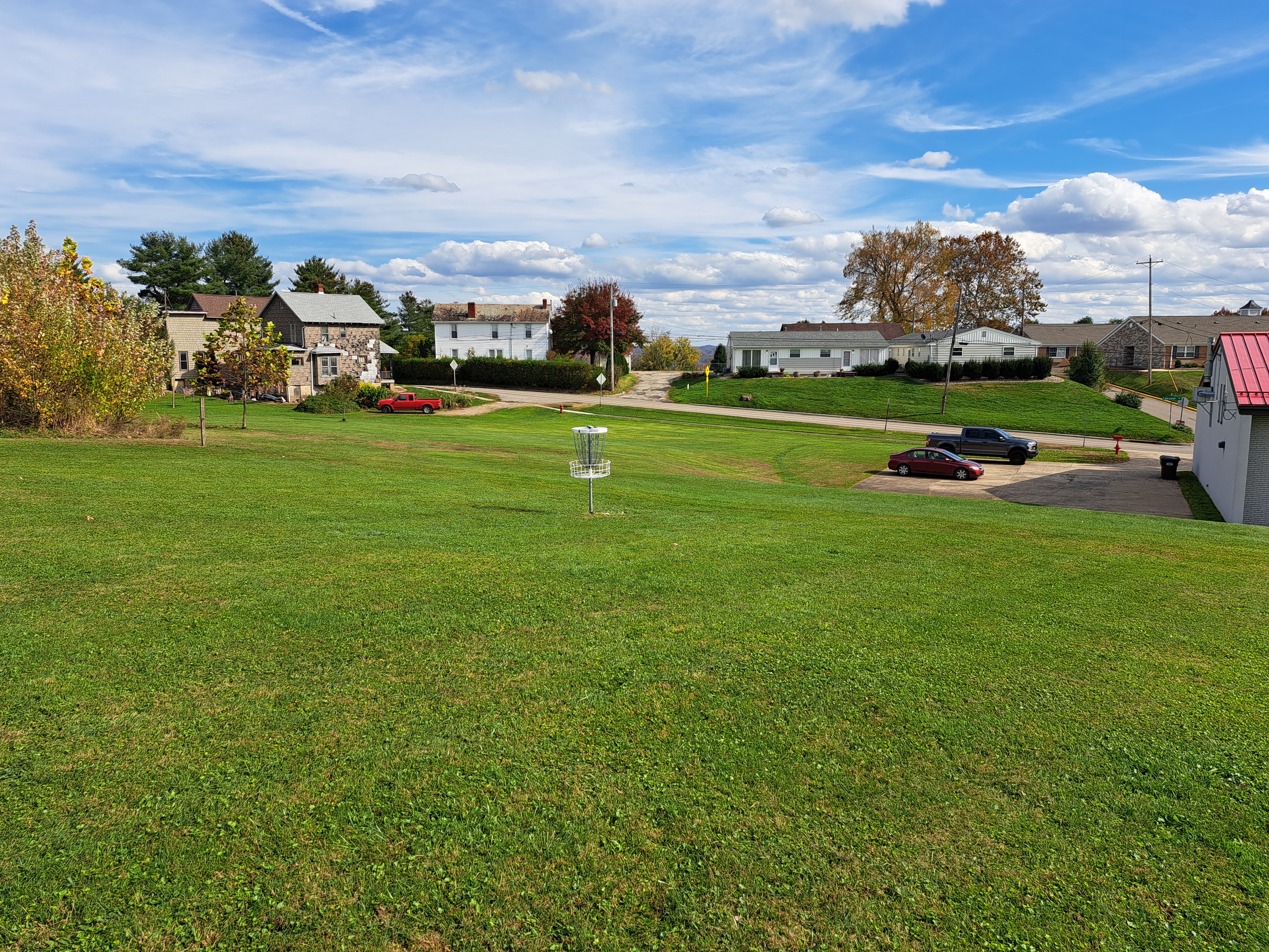 Comments: this gradually uphill hole plays across the paved park entrance road, so you have to check for vehicles before you throw. Other than the road and the parking lot to the left of the basket, there are no obstacles on this hole. #3 tee is behind the basket at the edge of the parking area.