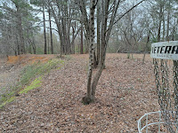 Comments: this tee was unmarked, but I think I found roughly the right spot based on information online. The most downhill hole on this course, this dogleg right requires you to hit a tunnel-like opening in the cedar trees that has sufficient width but low ceiling. If you get through that opening, it's a straight and open shot to the basket. Like the previous hole, this hole would be better if the trees were cut back and the underbrush removed. #8 tee is on the walking path behind the basket.