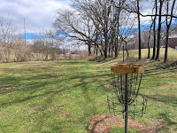 Comments: a long, mostly open hole that plays steeply downhill at first before flattening out. Try to keep your disc left of the row of trees at the bottom of the hill, but definitely avoid the dense woods to the far left. The basket is left of the row of trees, and the row is thick enough that getting through the row of trees is challenging but not impossible. Finding your disc in the dense woods to the far left might be impossible. #16 tee is across the park road to the right.